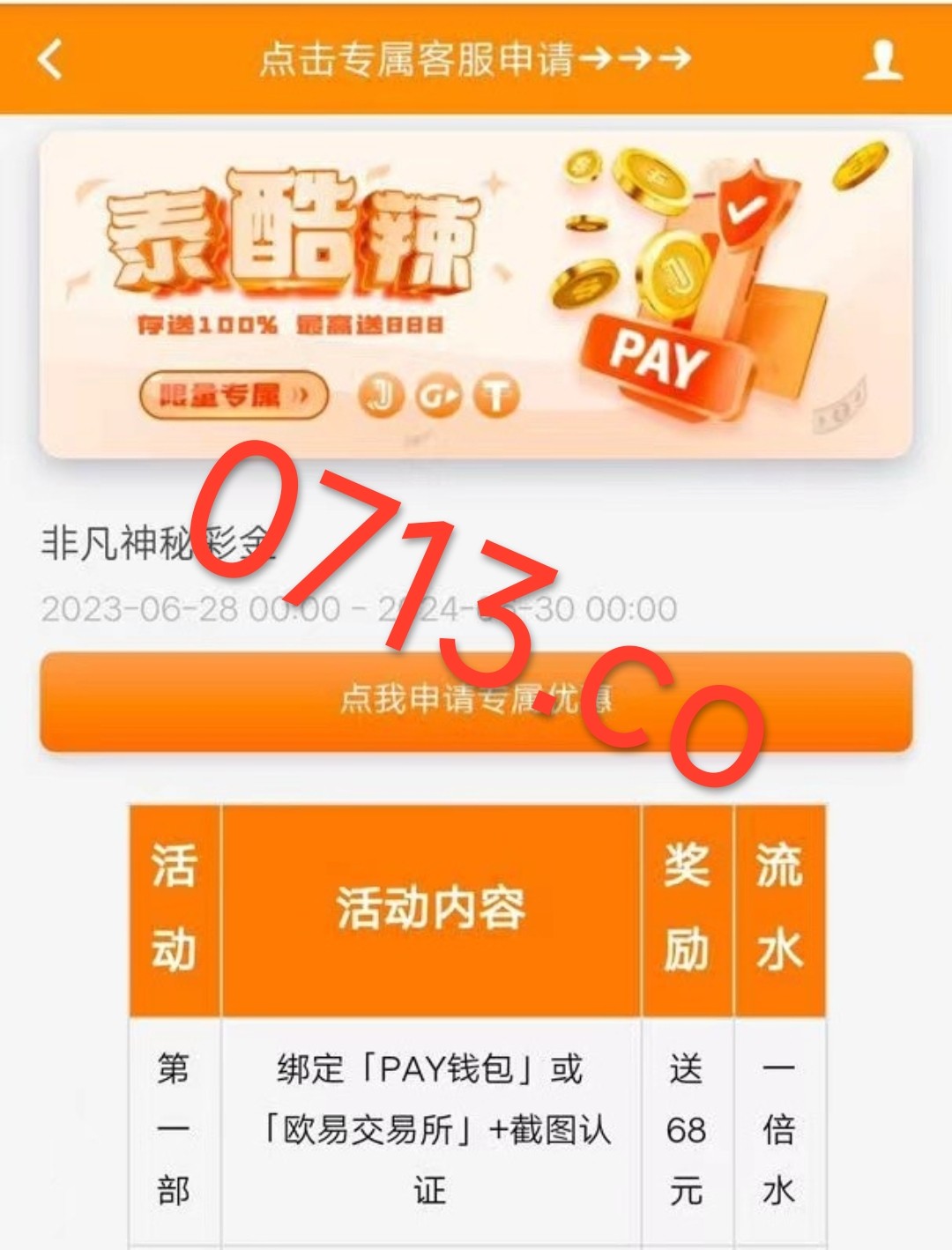 有账号存款过的登录进去主页有“泰裤辣”活动页面就是可以参加,如果没有这个页面就是不能参加了,绑定任何数字钱包提币链接送68,送的68赢了 提虚拟币再领38 (没号的就不用去了)