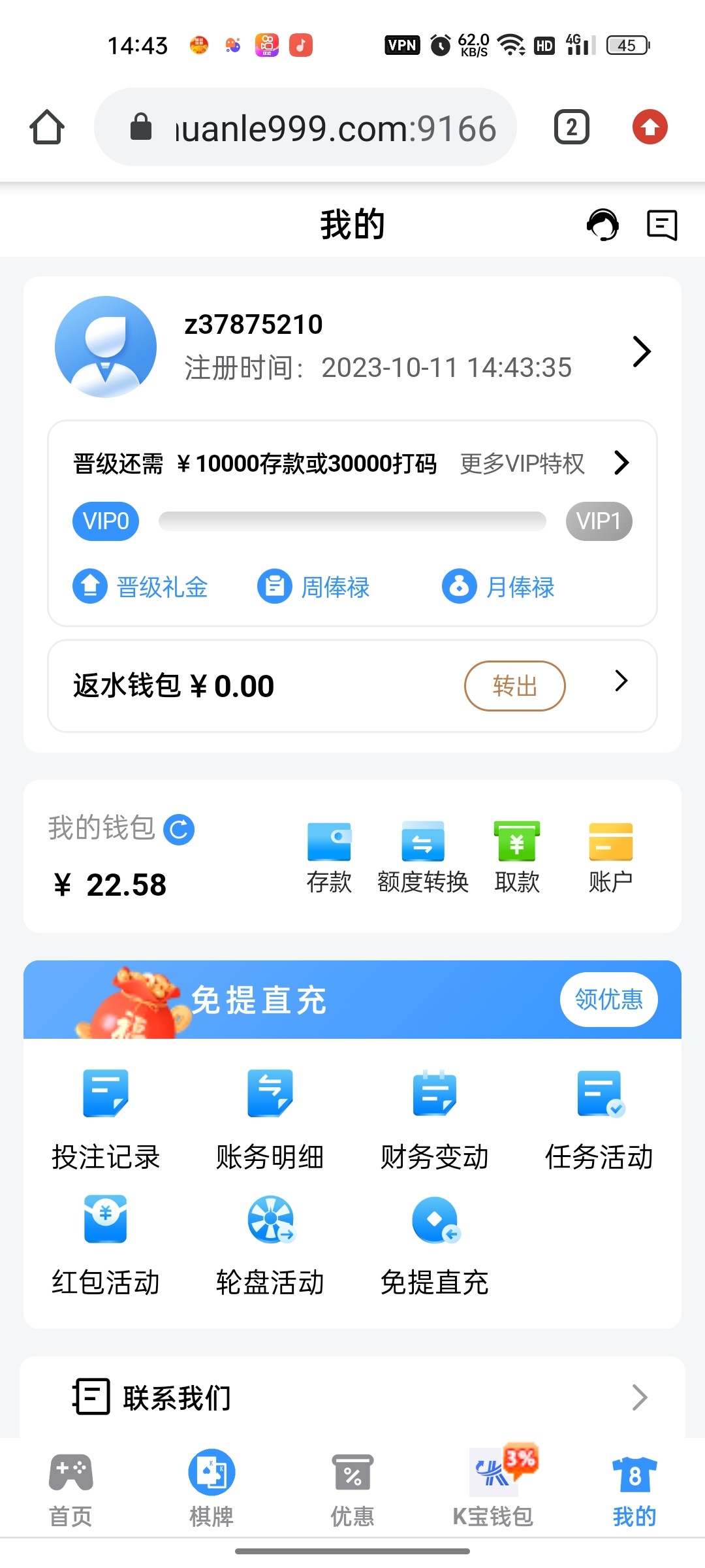 刚开始打了30局麻将糊了,后来不可以了,电子,捕鱼,都没了,体验金也没了