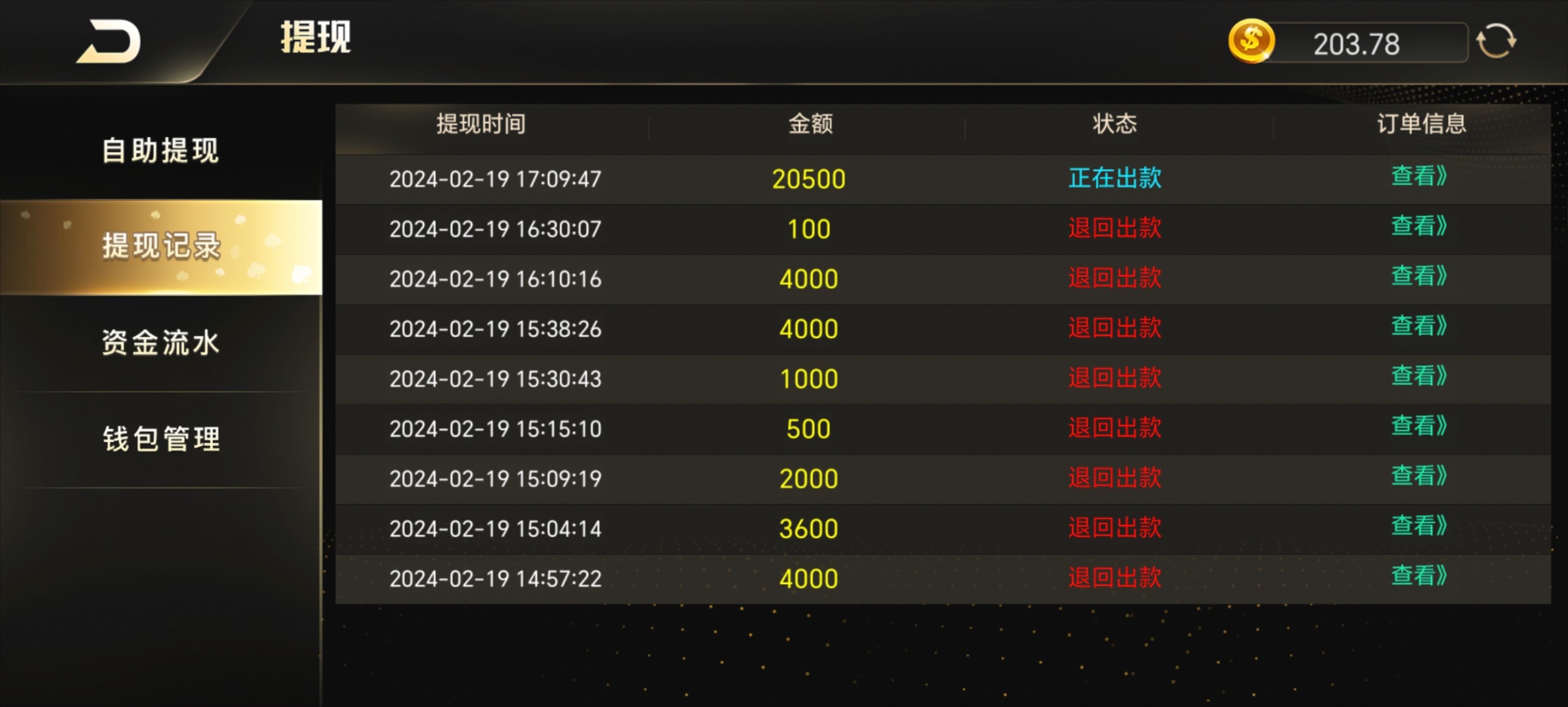 有这个平台的老哥别玩了,我踏马的充了几十万都v7了,提个2w块都不给出,提的钱包一直退回让我换什么同实名钱包提款,但是之前我提几百是给出的不是同实名也,后面我换了同实名钱包还是不给出,真几把无语了