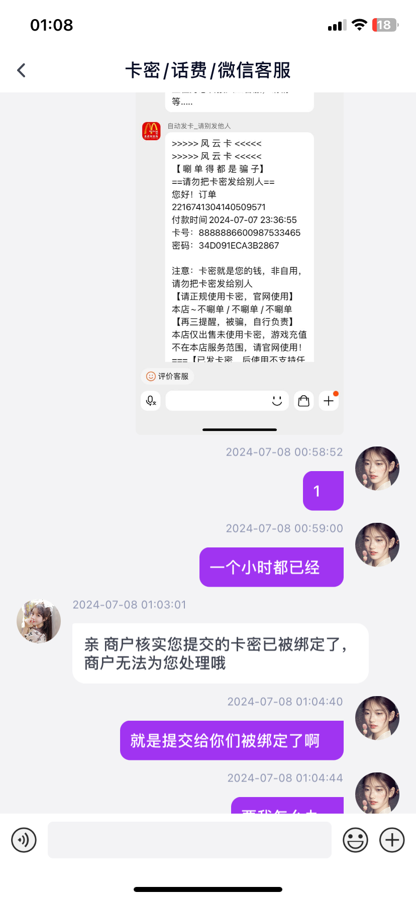 我前段时间也是 问鼎最恶心的是它第一次帮我查询说查到卡密了是它们绑走的 然后那个傻逼客服立马撤回消息 改口说它们的销卡商没查询到我的卡密