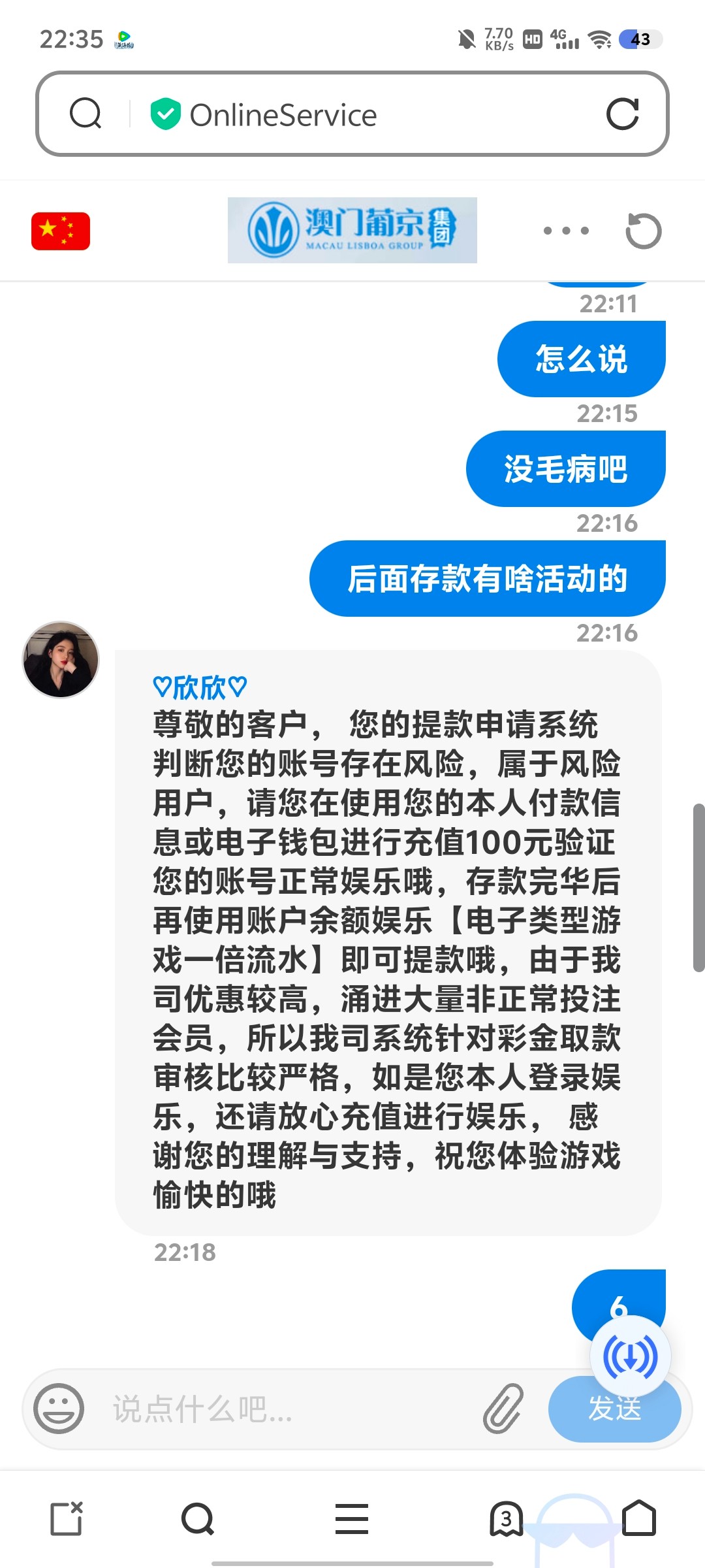 先是拒绝,说账号有风险,充值100,后面冲完以后提现300,然后提现两次,全部退回,第一次退回300让我提供是不是本人使用的手机号,提供了以后,重新提款,第二次退回什么也没说,直接让我重新提款,然后一分钟没到,直接跟我说到账了,空汇,100都黑,你们自己看着来吧
