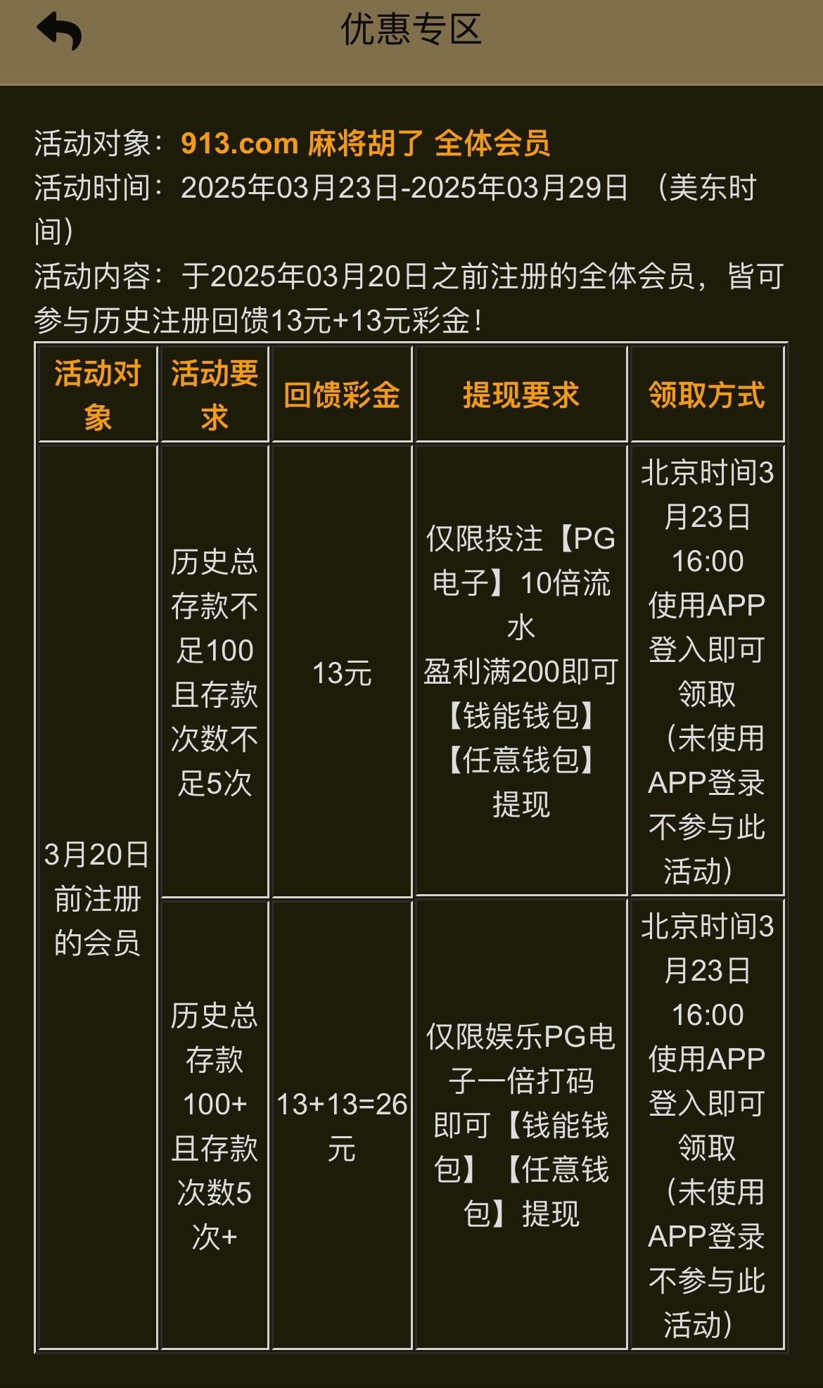 在3月20号之前注册的老哥可以下载APP领13彩金,充值过100以上存款5次以上可以领26