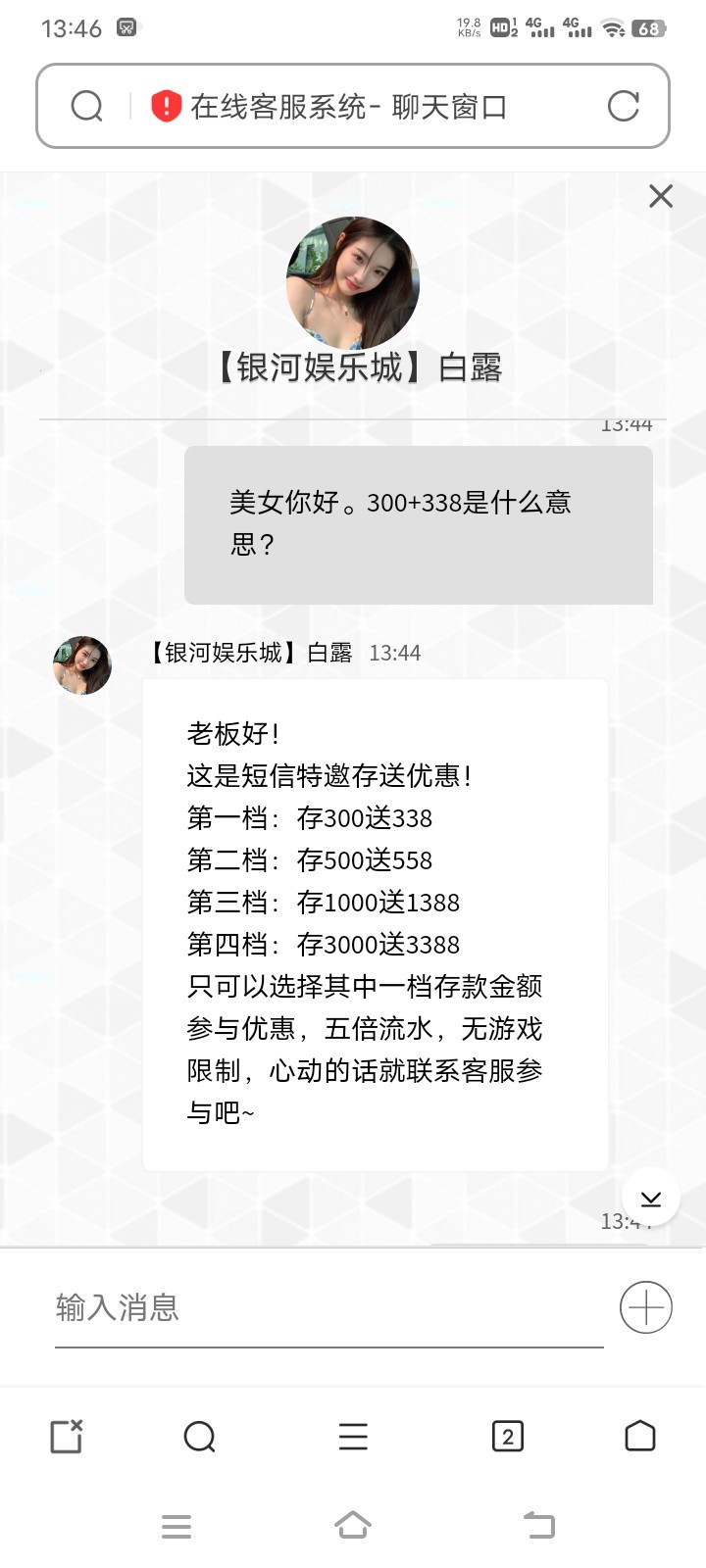 月初回馈出了点款。想问问各位撸友有没有收到银河的300+338短信特邀。不限游戏5倍水。可以去撸么,第一次接触这个,问问有没有人撸过,谢谢。