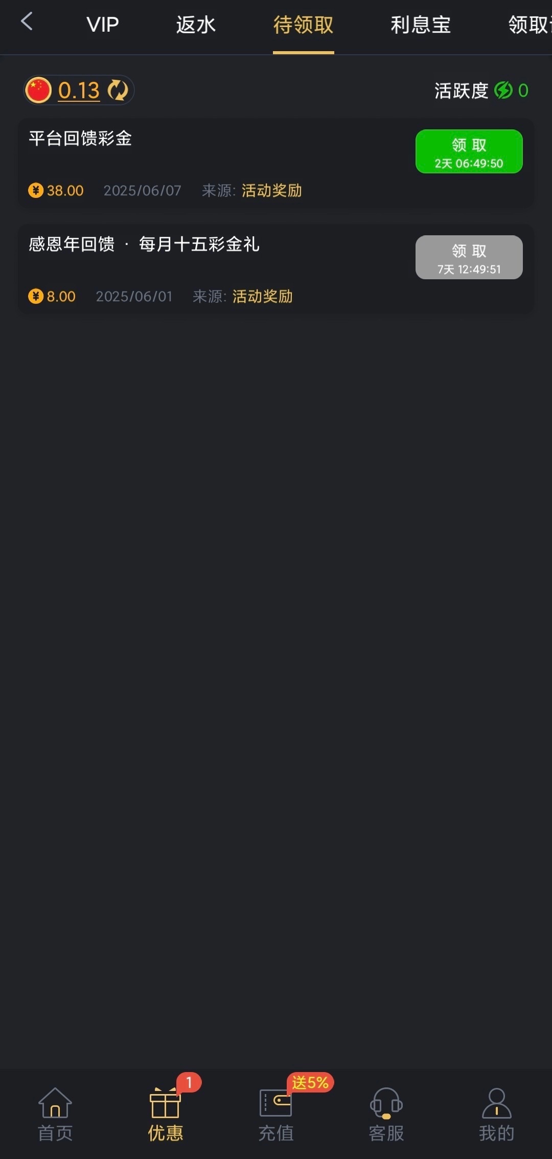有充值过的兄弟登入上去看优惠是否有彩金