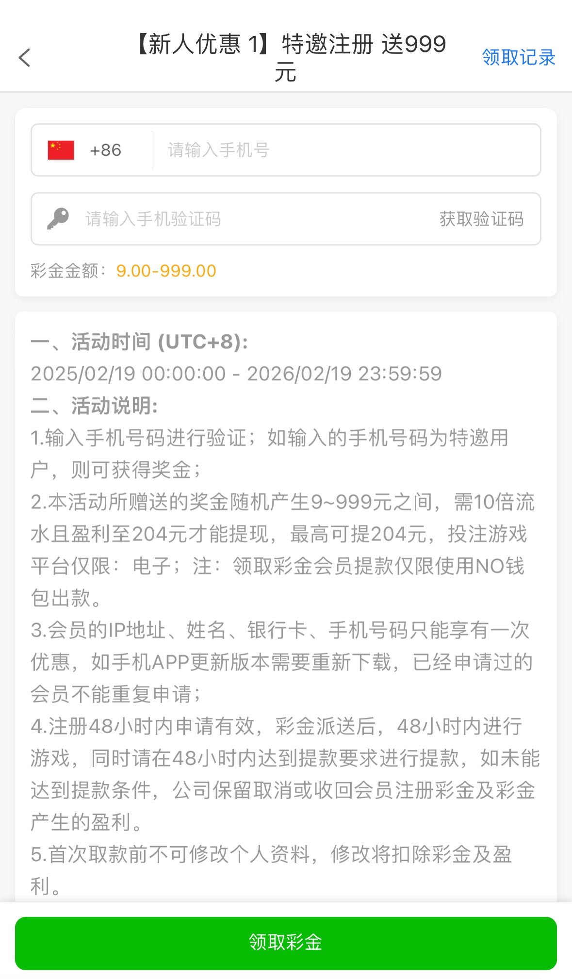 注册完善资料优惠自助领取,限电子,10倍流水,204提现,只能用NO钱包提