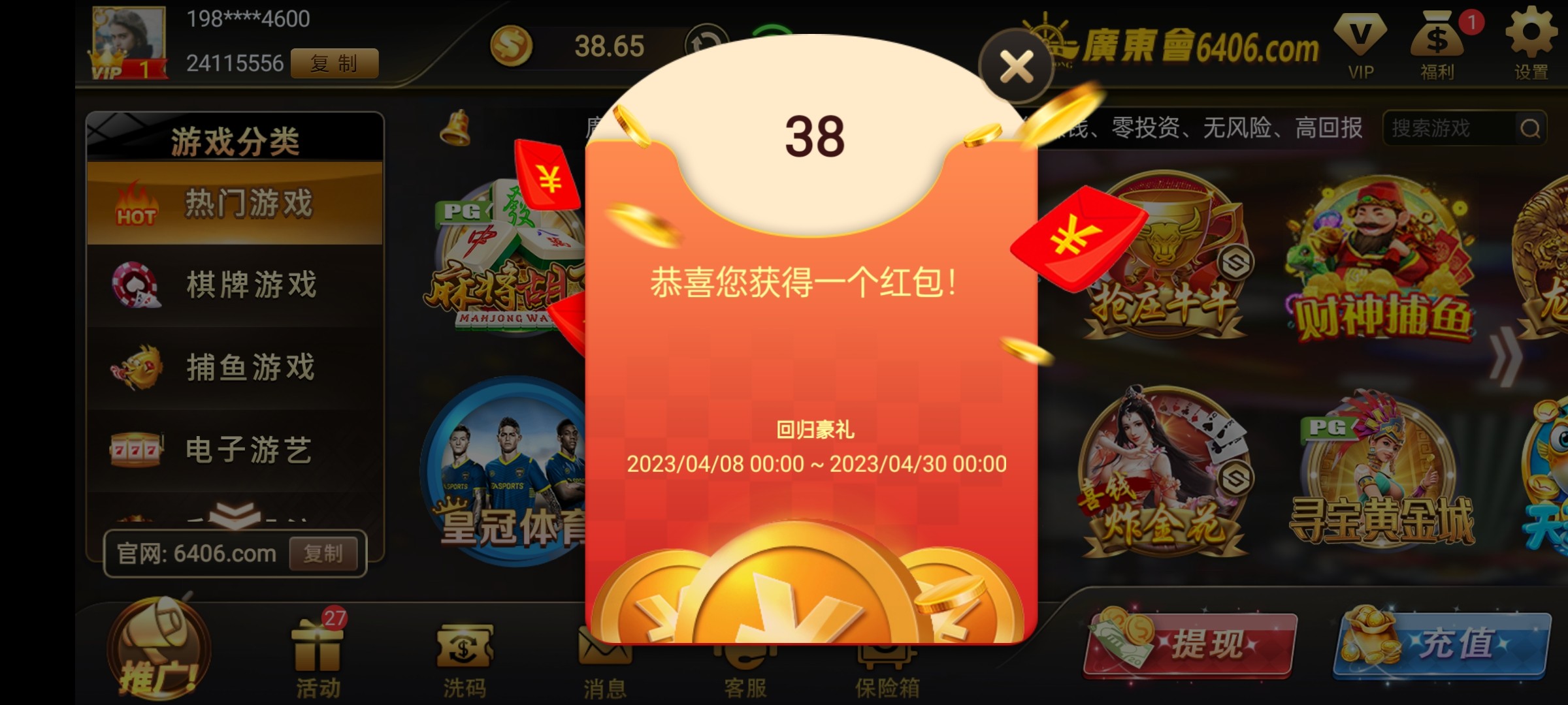 怎么都没有,我两个号都只充值过100,今天两个号都给了38
