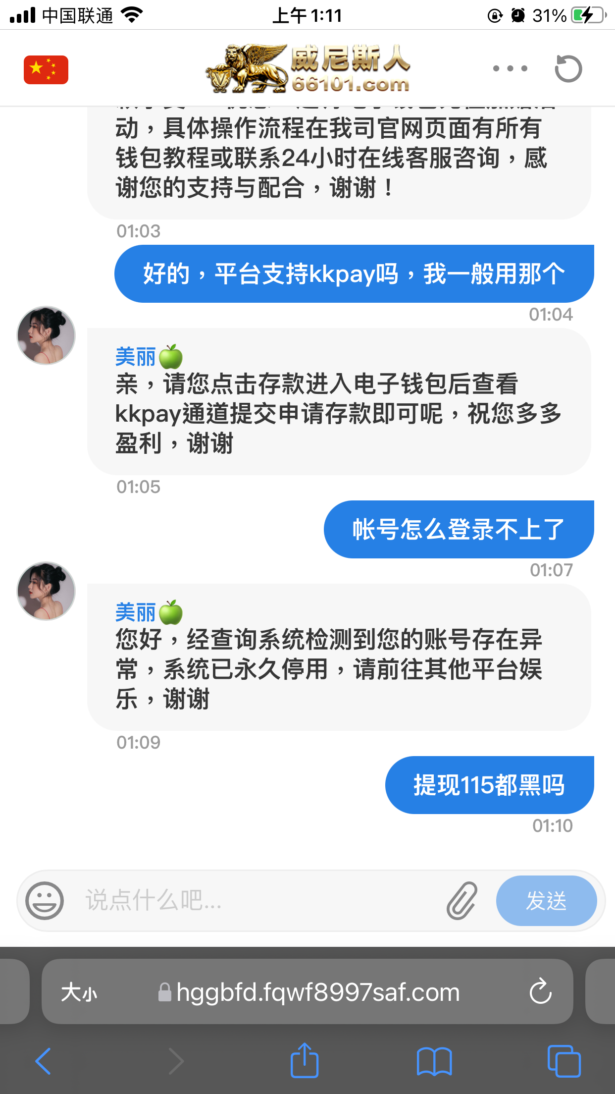 ygh4057 ▶ aa11924924 我的136也黑了,以前送过188取款200到了,电话邀请回馈28 每天签到8.8好像是30天,第三天赢到136取款注单异常说不欢迎。 2023-6-10