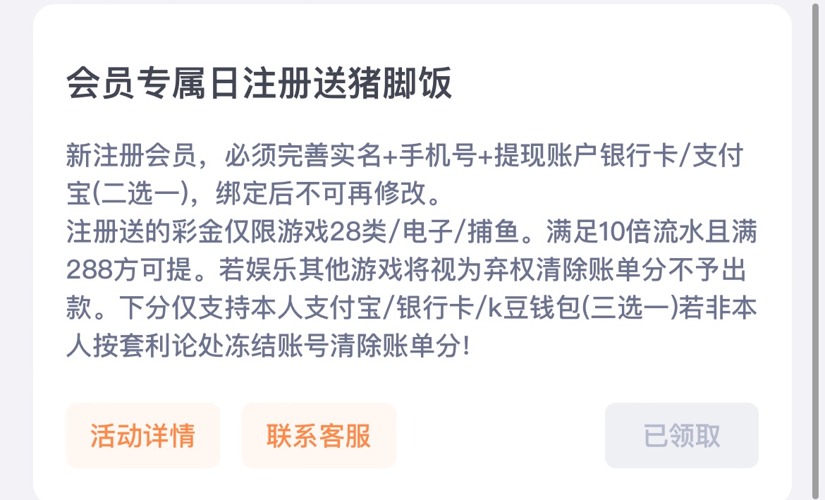 每月8号18号28号当天注册的送28彩金,新用户注册绑定手机号/银行卡/支付宝在优惠大厅申请,72小时内送,限28类游戏/捕鱼,10倍流水,满288提现,下分只能用银行卡/支付宝/k豆
