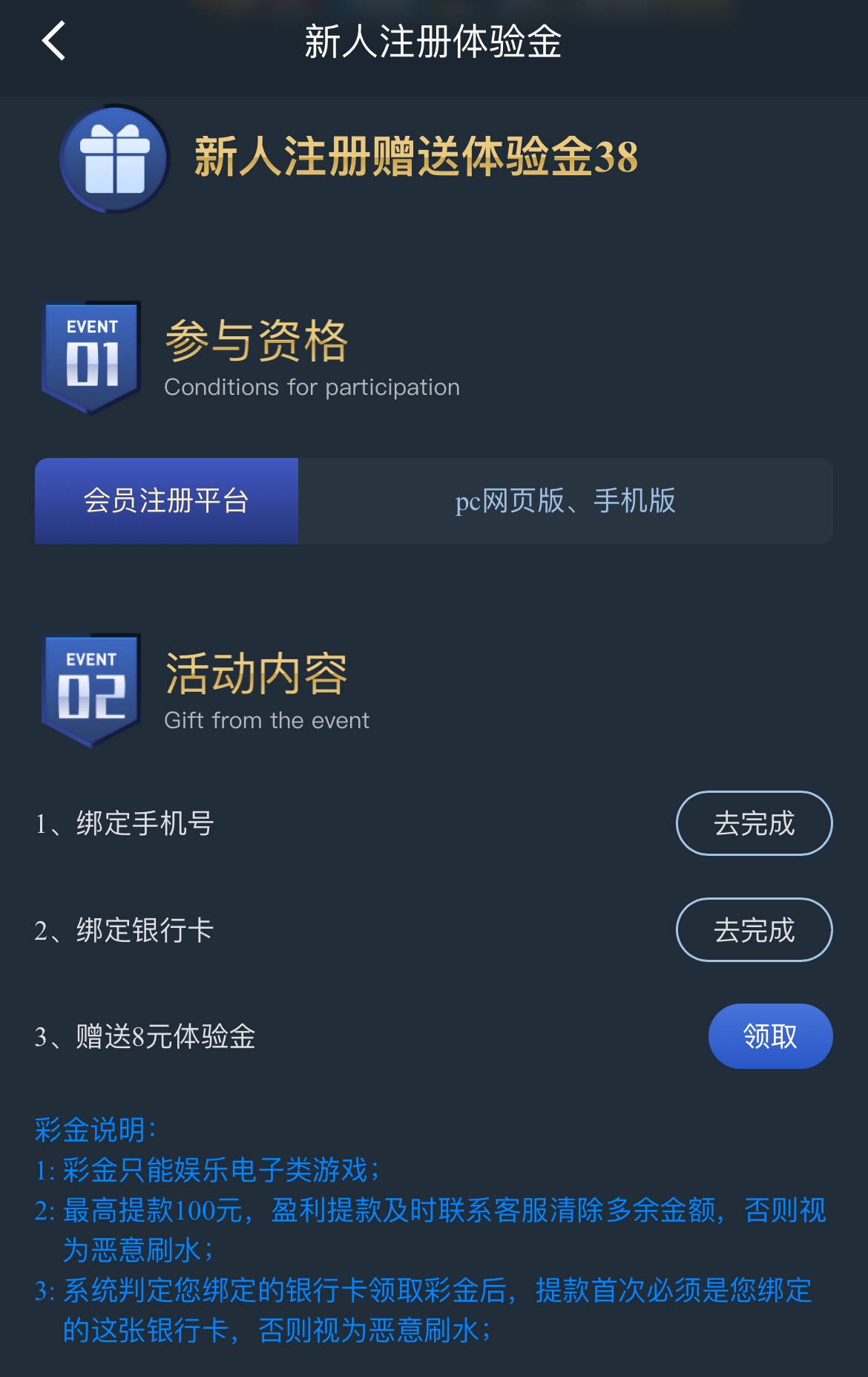 注册绑定手机号银行卡优惠领取,只能娱乐电子,最高提100